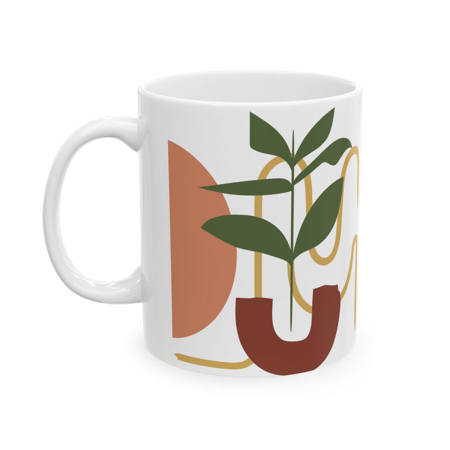Une tasse en céramique brillante et éclatante qui apporte une ambiance chaleureuse et artistique moderne à vos pauses quotidiennes. La céramique blanche immaculée met en valeur un design abstrait et naturel composé de formes en terre cuite, de verts doux et d'accents moutarde, évoquant un atelier confortable rempli de plantes. Elle est robuste et lisse au toucher, dotée d'une poignée en C confortable et d'une finition brillante qui fait ressortir les couleurs.